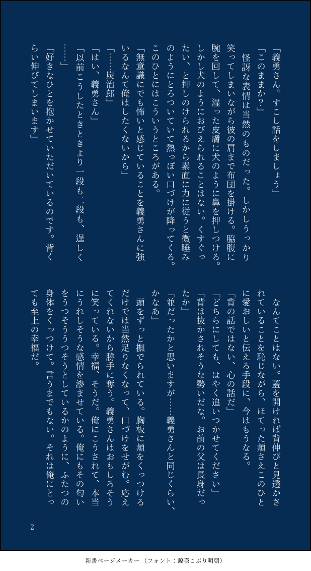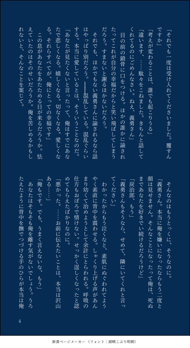 「義勇さん。本当に俺を嫌いになったならもう二度と顔は見せません。そんなことになったって俺は、死ぬまであなたを好きでい続けるだろうけど」